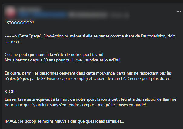 Or, pour l'instant, SlowAction.tv, c'est juste deux cocos armés d'un clavier qui ont décidé de faire rire les gens plutôt que de pleurer devant les temps au tour. On ne casse pas le marché, on essaie juste de ne pas casser nos ordinateurs en rigolant de vos exploits.